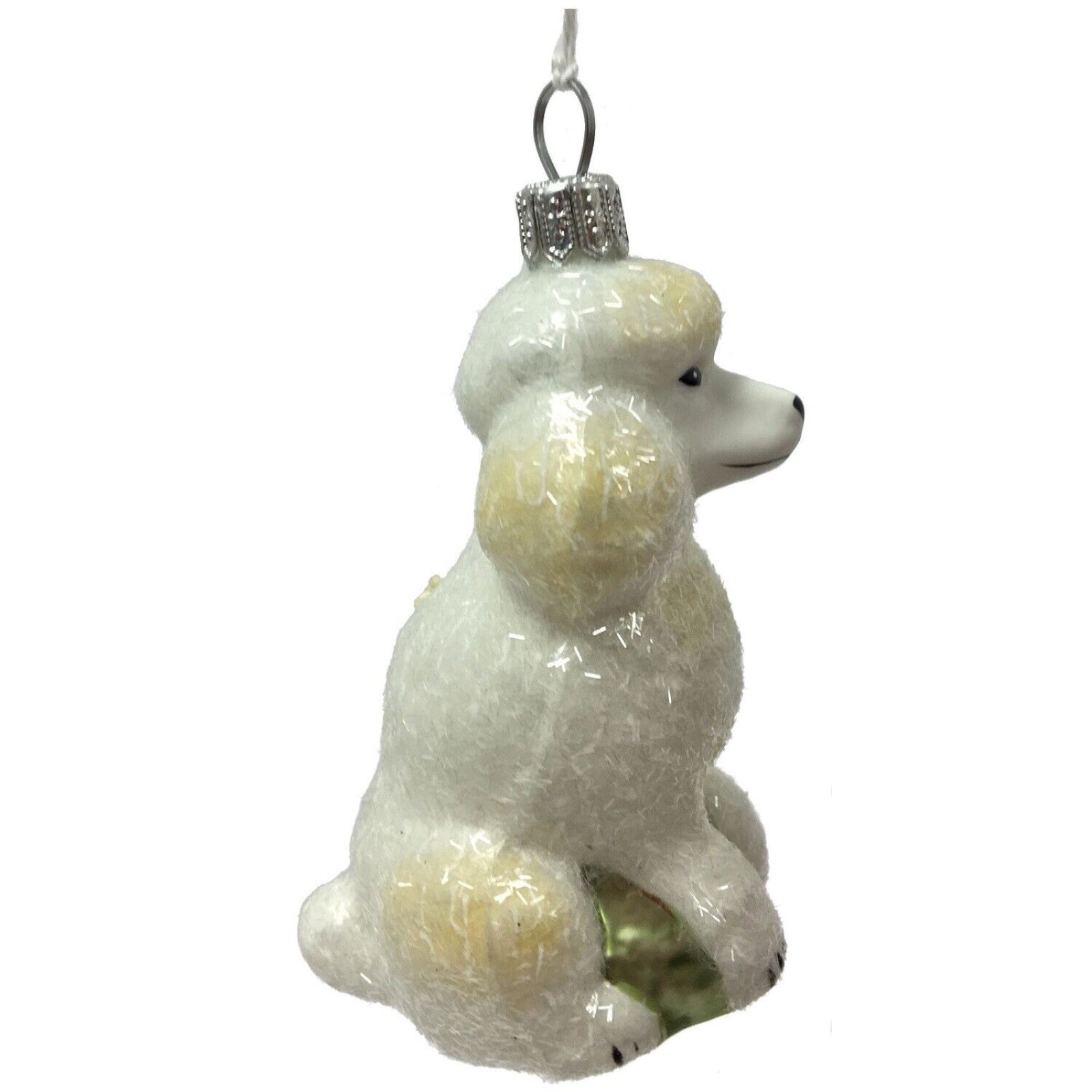 White Glitter Poodle Ornament. Handcrafted in Poland. Hand-painted. Made from mouth blown glass. Approximately 1.5 x 2 x 3.25 inches. Includes original Pinnacle Peak Trading box and packaging. Imported by Pinnacle Peak Trading Company.