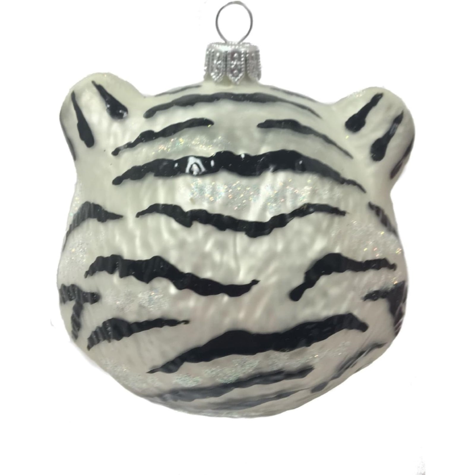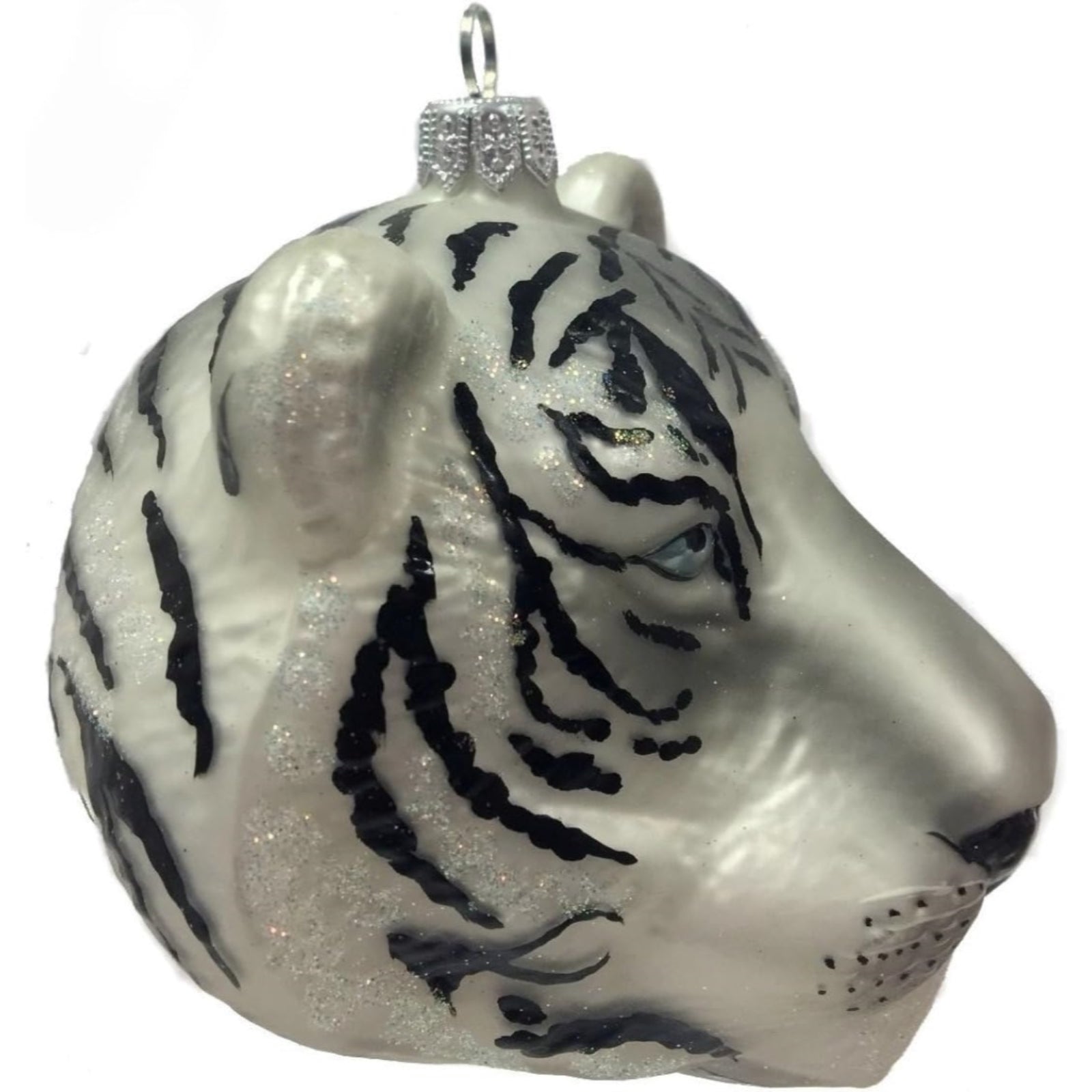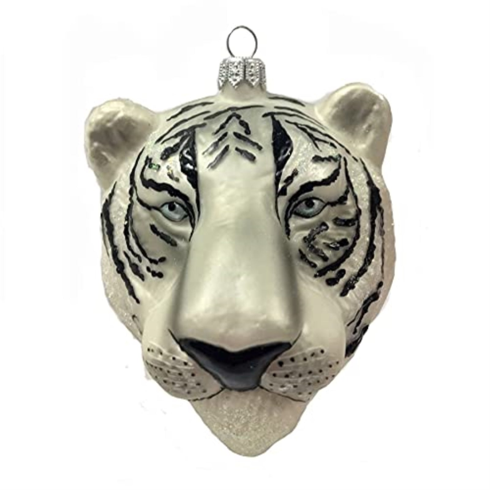 White Tiger Head Ornament. Handcrafted in Poland. Hand painted. Made from mouth blown glass. Approximately 3.5 x 3.5 x 4 inches. Includes original Pinnacle Peak Trading box and packaging. Imported by Pinnacle Peak Trading Company.