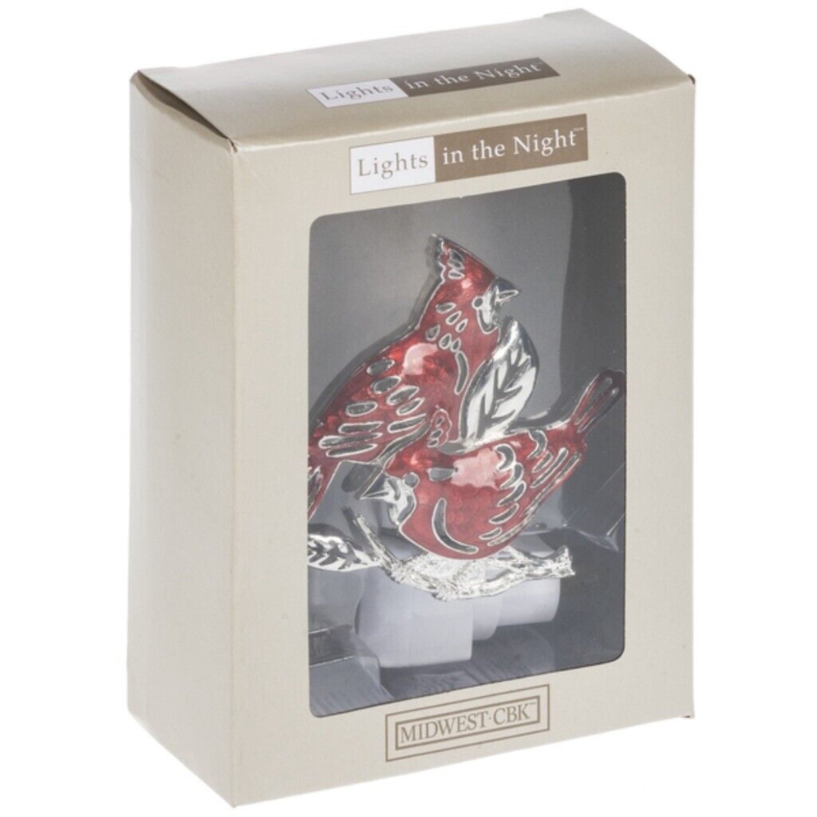 Cardinals on branch night light. Plug in night light. Made from metal and plastic. Dimensions: 3.75 W. x 2 D. x 3.5 H inches.