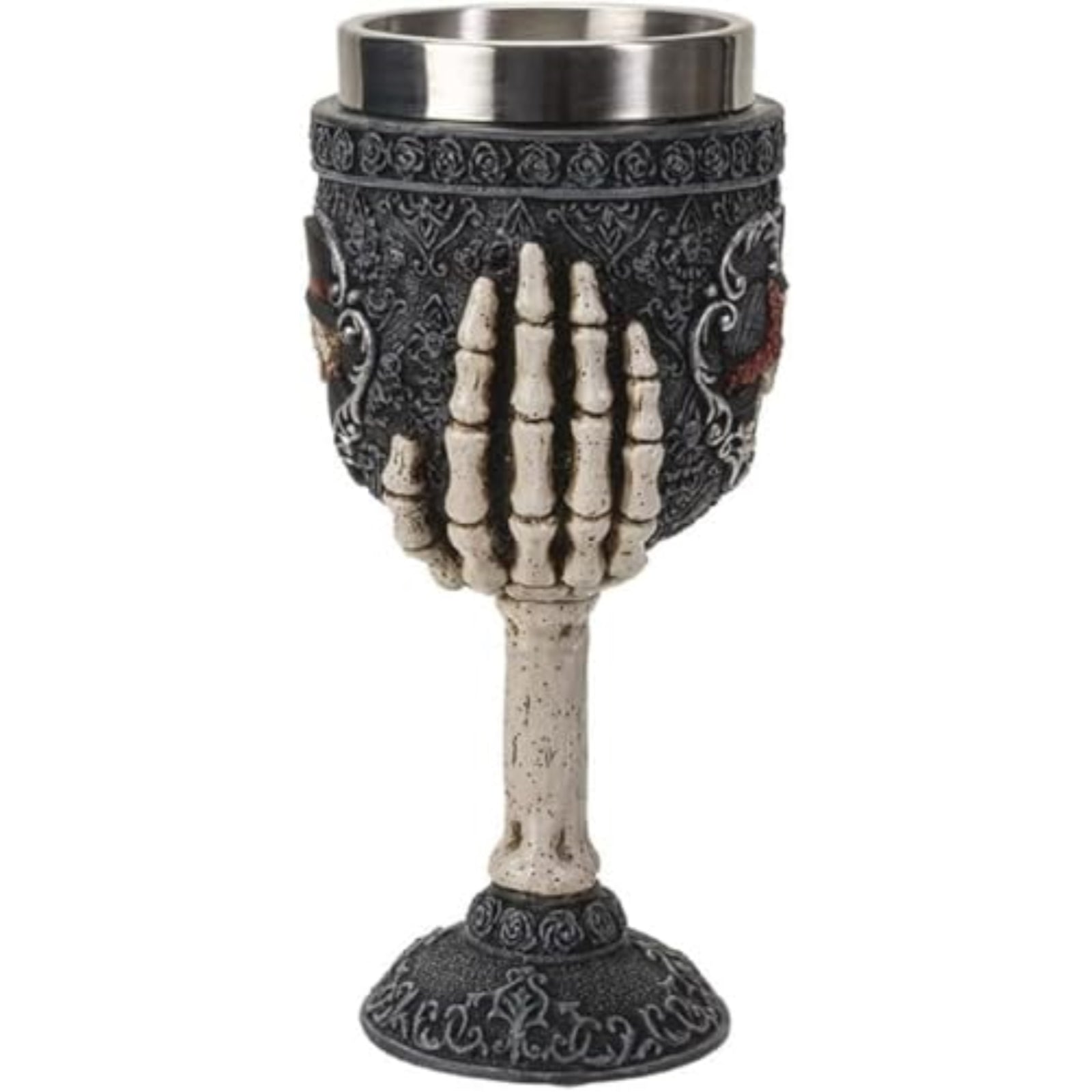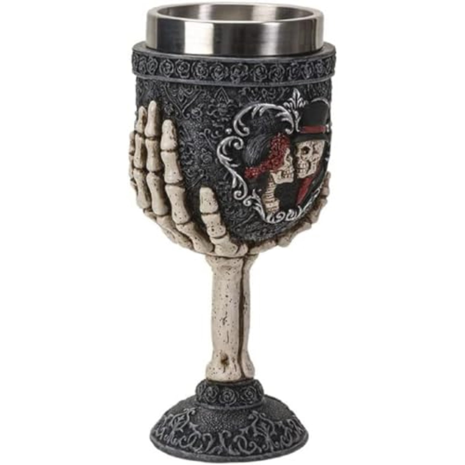 Skeleton couple wine goblet chalice. Has a resin body with a stainless steel cup. Holds approximately 7 ounces. Approximately 3 x 3 x 7 inches.