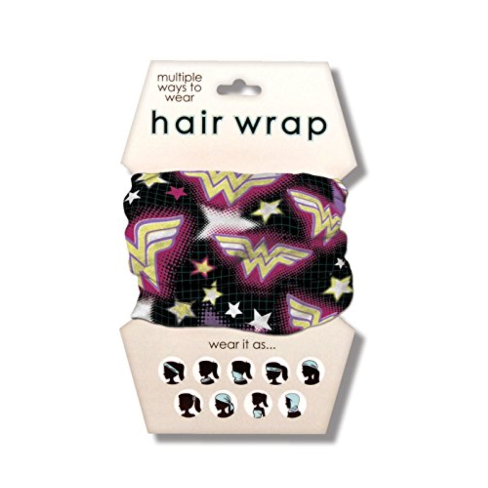Wonder Woman logo. Made from polyester. Each wrap is approximately 19 inches long. Wrap can be used multiple ways such as bandana, headband, hair tie, gaiter and scarf. Made by Spoontiques. Officially licensed product.