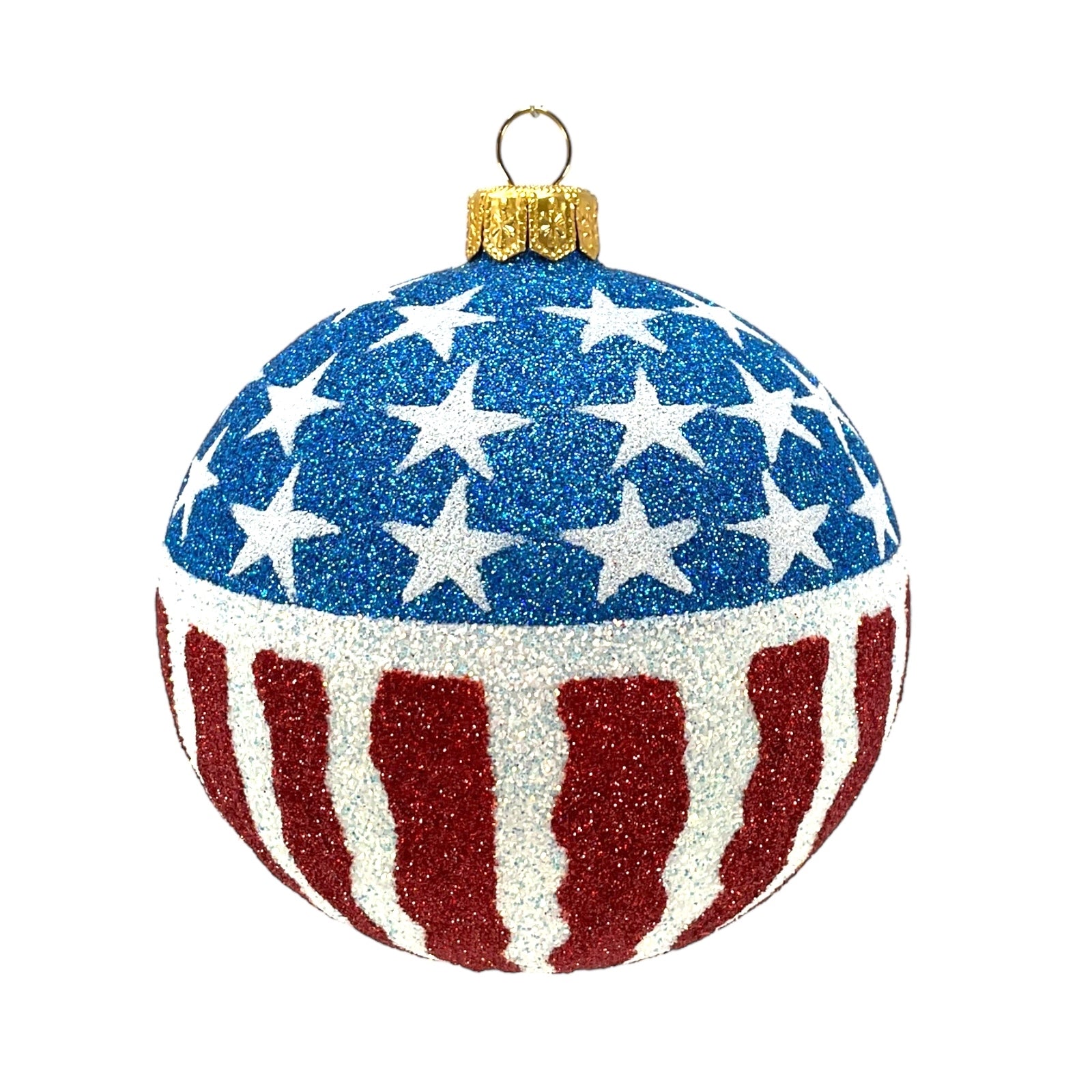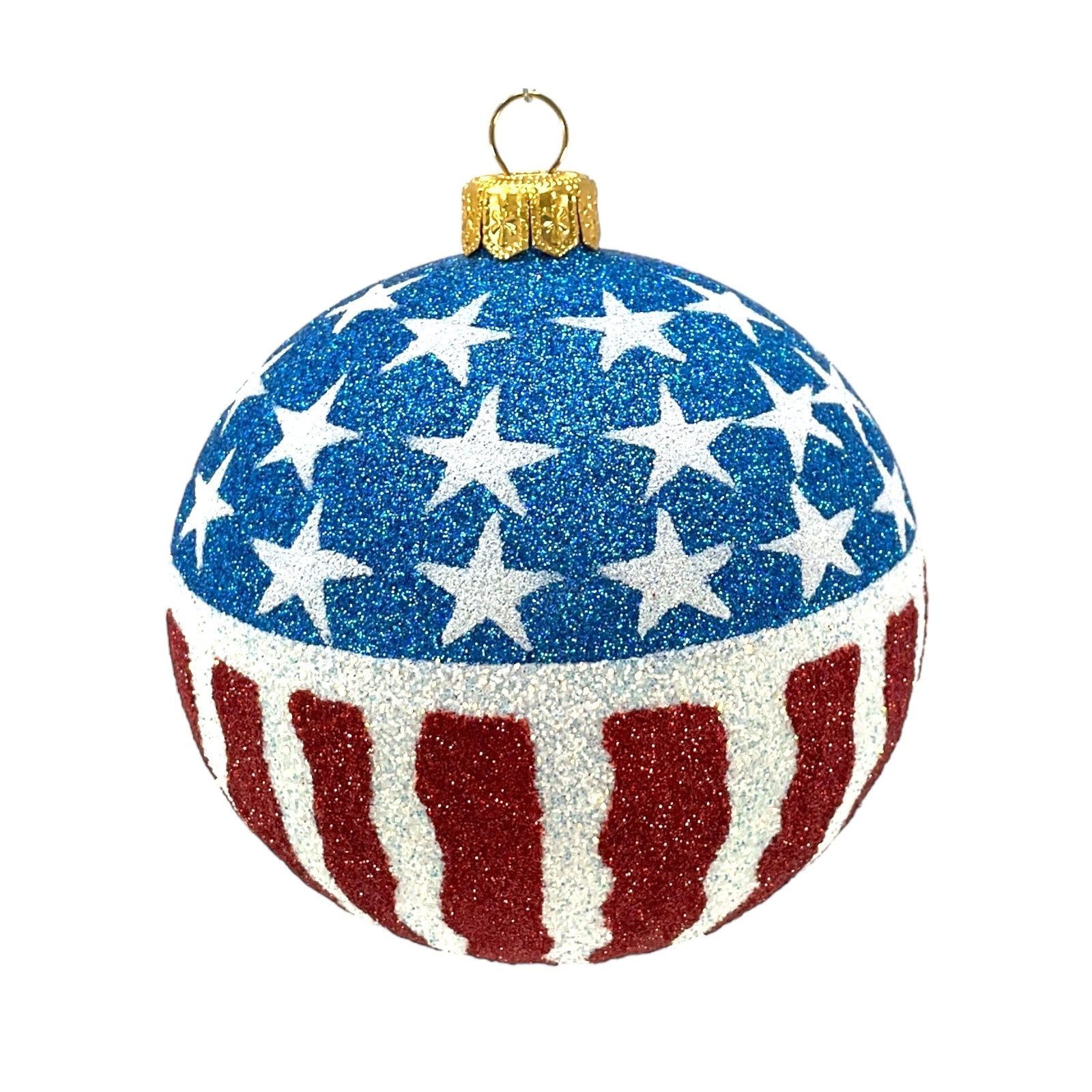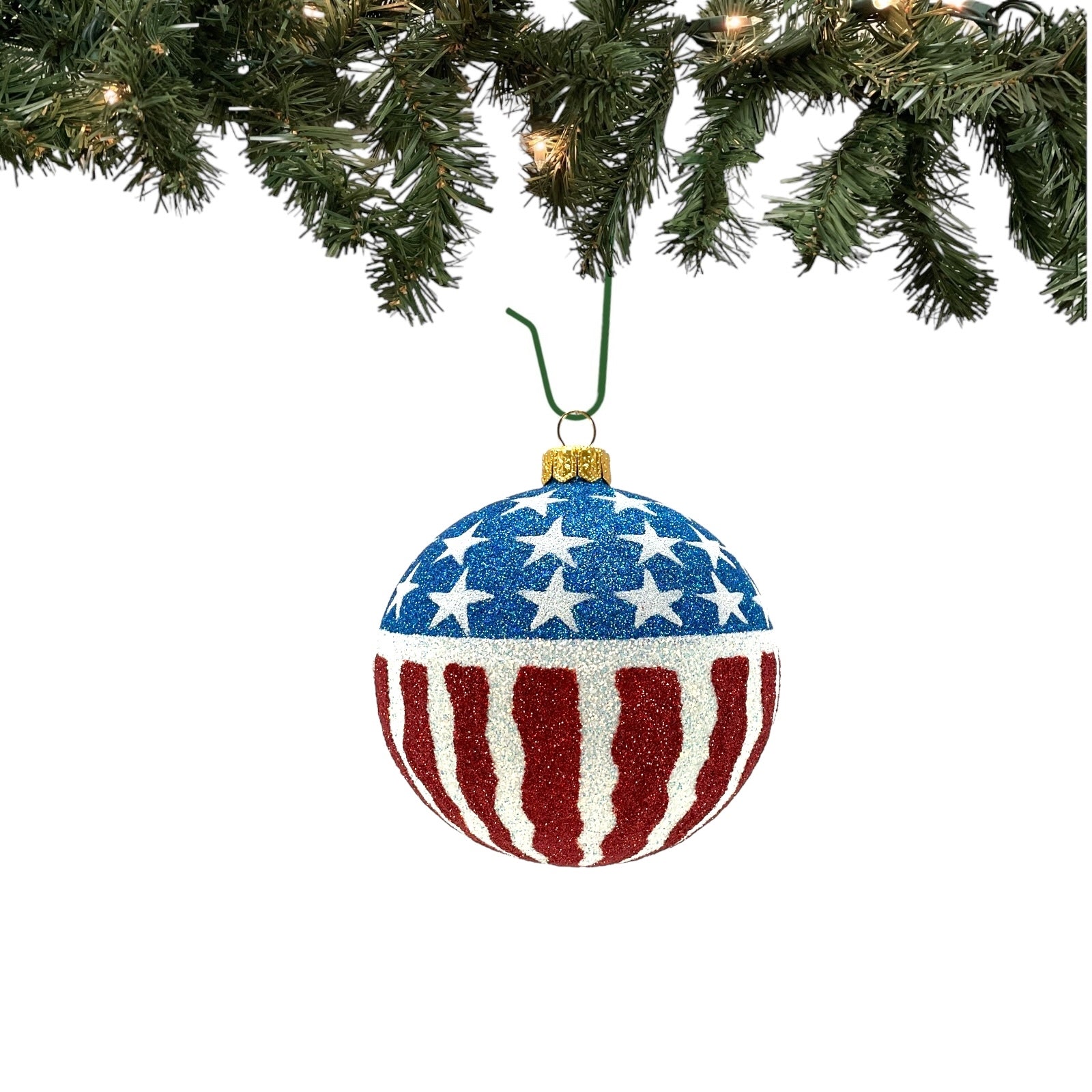 Stars & Stripes Ball Christmas Ornament. Made of Polish Glass. Made by Thomas Glenn. The High Design Collection. 4 Inch Diameter